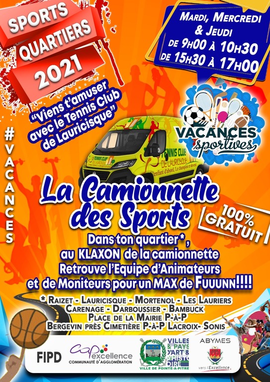 🔴 Du 06 au 29 juillet 2021 🟠 « la camionnette des sports » en image 🎾🥅🥊🎯🎽🏀🏒🏅🎉 Elle sillonnera les quartiers de l' @agglocapex (Pointe-à-Pitre/Abymes) afin de proposer aux enfants à partir de 6 ans et aux jeunes n'ayant pas de pratique sportive, une animation autour d'activités physiques et sportives. Un projet évident pour permettre à des jeunes de faire du sport dans leur quartier au cœur même de leur résidence ; Un projet solidaire, social et sportif.